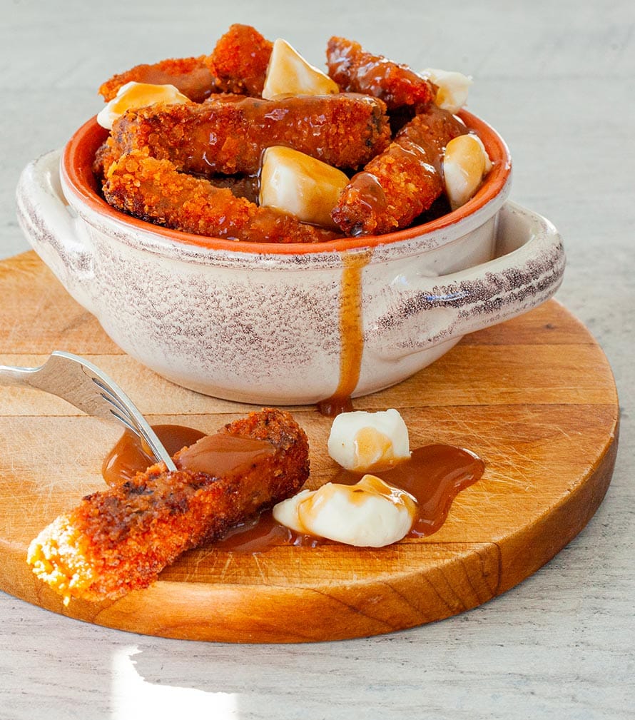 Déposer les frites de tempeh dans des bols, garnir de fromage en grains et arroser de sauce brune bien